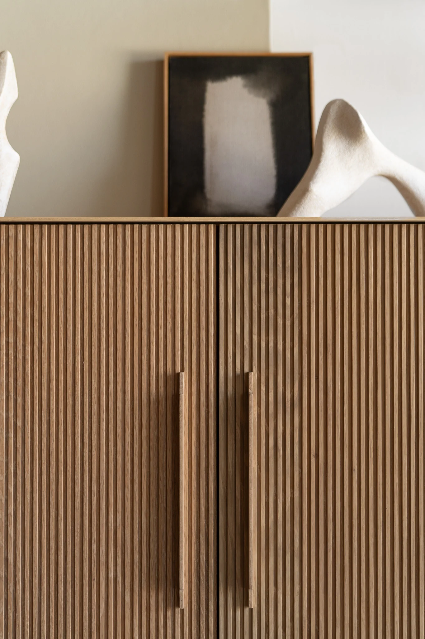 The Baldwin Credenza by Croft House is handmade locally in Los Angeles, California. The oak casing has a thin profile that borders the doors beautifully. All five doors showcase a vertical flat fluted oak face, finished with a natural toned durable finish. The Baldwin Credenza is accented with a mixture of solid oak and walnut handles, each sized to the door by hand. The cabinet doors are fitted with slow close hinges and an adjustable shelf sits inside for flexible storage.