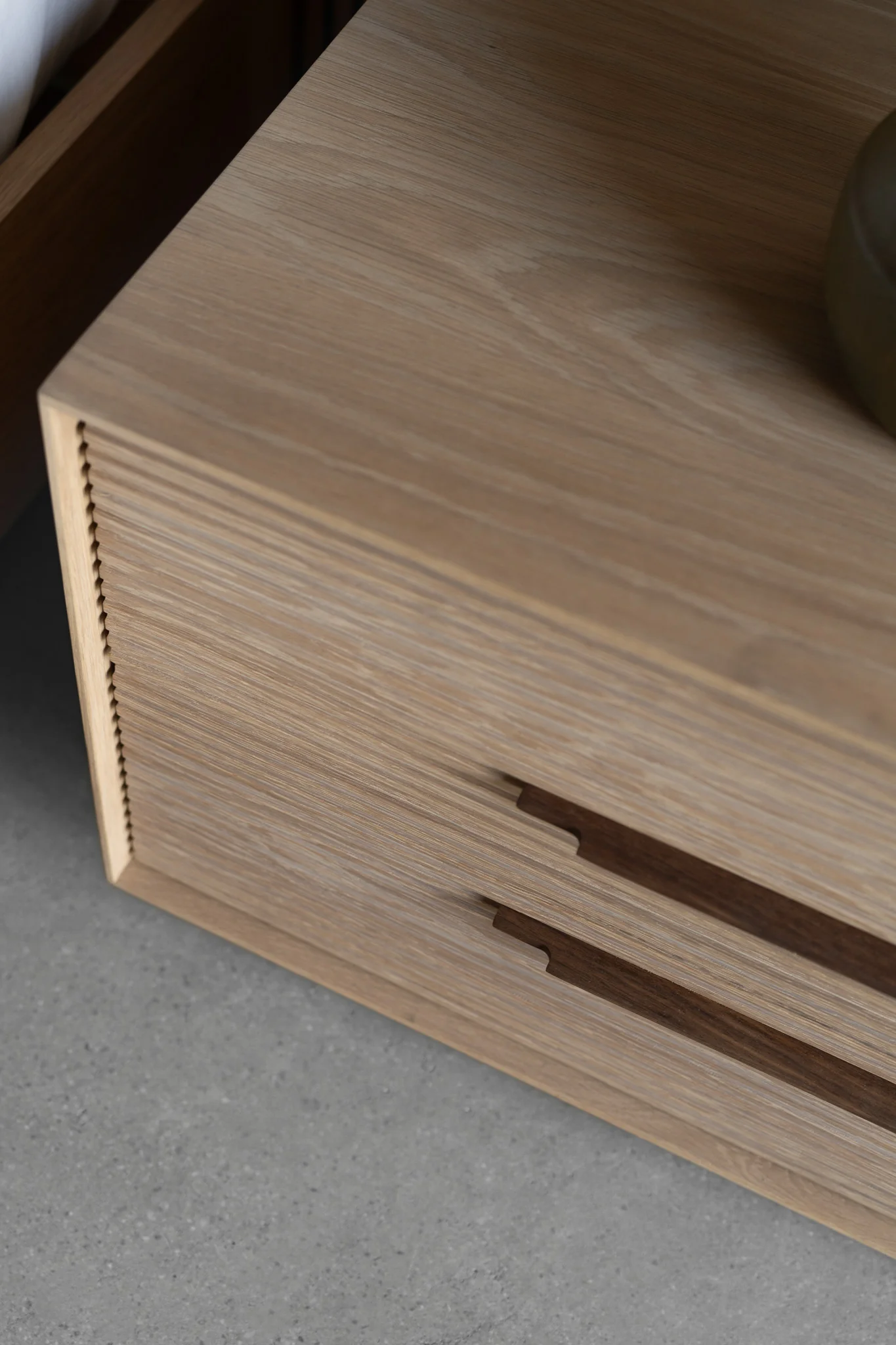 The Baldwin Nightstand by Croft House is handmade locally in Los Angeles, California. The oak casing has a thin profile that borders the drawers beautifully. The two storage drawers showcase a horizontal flat fluted oak face, finished with a natural toned durable finish. The Baldwin Nightstand is accented with solid walnut handles, each sized to the drawer face by hand. The drawers are fitted with slow close slides.