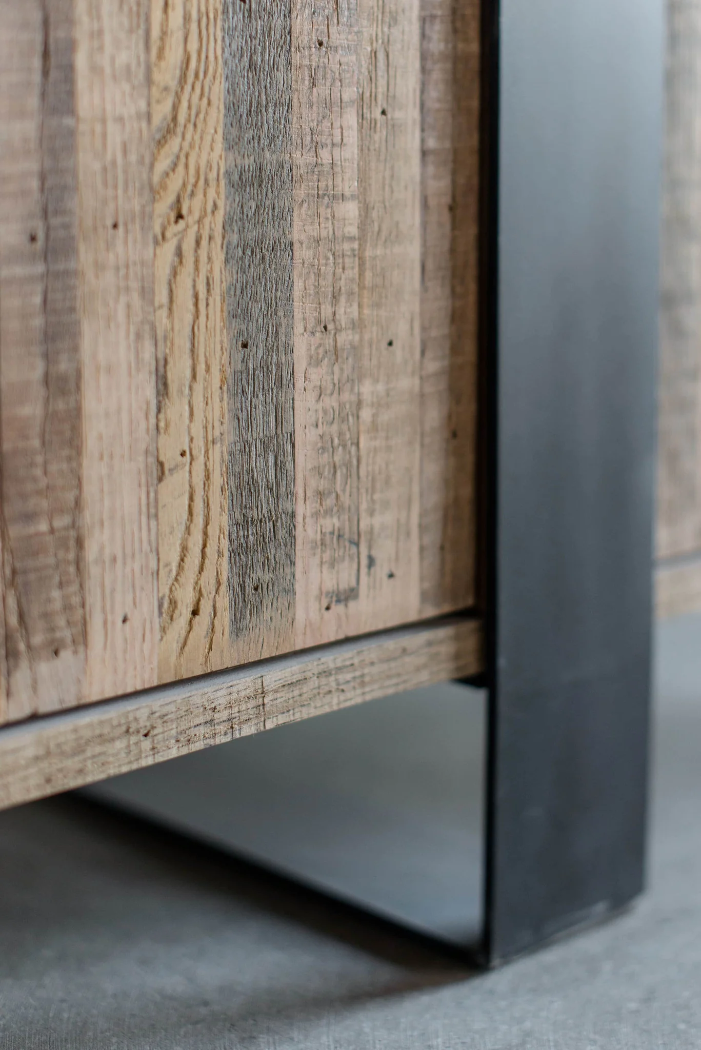 The Mossam Media Cabinet by Croft House is handmade locally in Los Angeles, California. The cabinet represents a celebration of the variance and unique character that reclaimed wood and other natural, sustainable materials have brought to the design world. The casing and doors are reclaimed, mixed oak, salvaged from pre 1950’s architecture throughout the continental United States, including barns in Ohio, Wisconsin, and Alabama. The natural variation in the wood is preserved with only a light sanding and no finish. Two metal straps modernize the design of the piece by incorporating an industrial break in the reclaimed aesthetic, while providing a functional, sophisticated leg design.