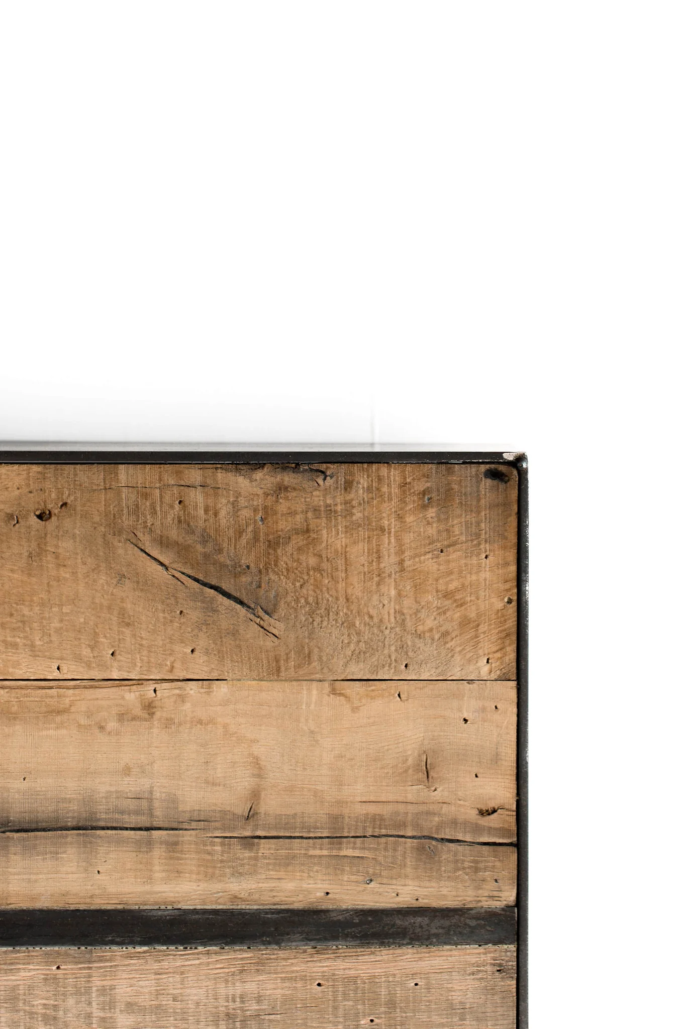 The Mossam Platform Bed is crafted from reclaimed hardwood and accented with steel trim, making it a blend of rustic and modern design. The reclaimed wood, sourced from architecture around the United States, adds a unique character to each piece. The steel trim complements the wood, bringing an industrial edge to the design. With its clean lines, this bed fits seamlessly into a range of interior styles, from industrial lofts to modern homes.