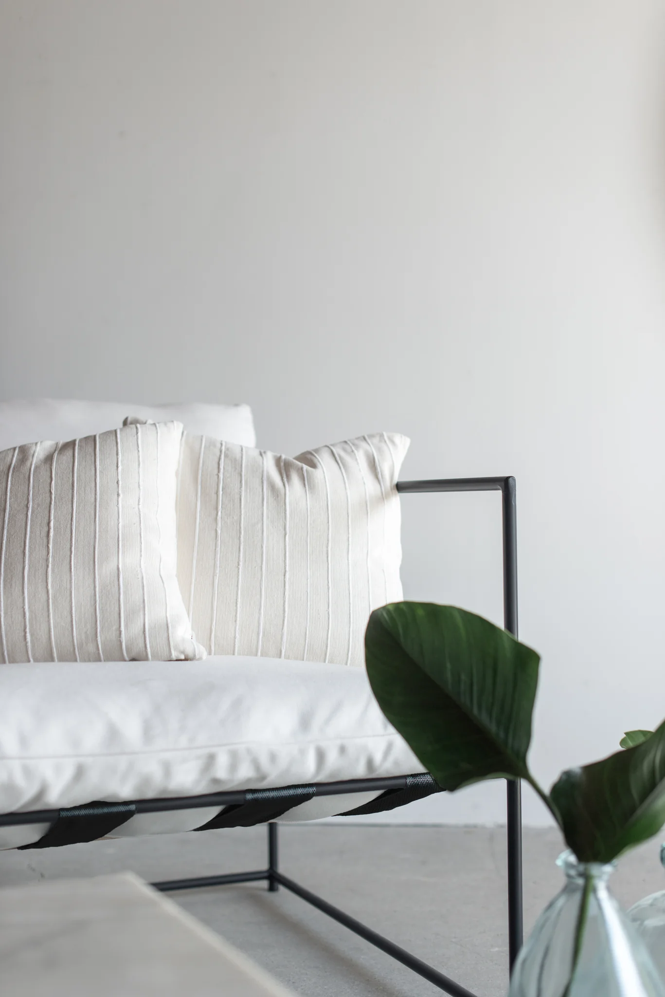 The Outdoor Sierra Chair by Croft House is handmade locally in Los Angeles, California. Croft House’s flagship upholstered piece is regarded for not only its distinct design, but its exceptional comfort as well. An open, thin steel frame allows the design to incorporate negative space and natural light as if they are tangible materials used to construct the chair. The clean lines of the frame are complimented with four straps of slung straps, softening the piece with a more relaxed feel. The straps cradle a single, large all poly fiber pillow, creating a cozy and natural seat.