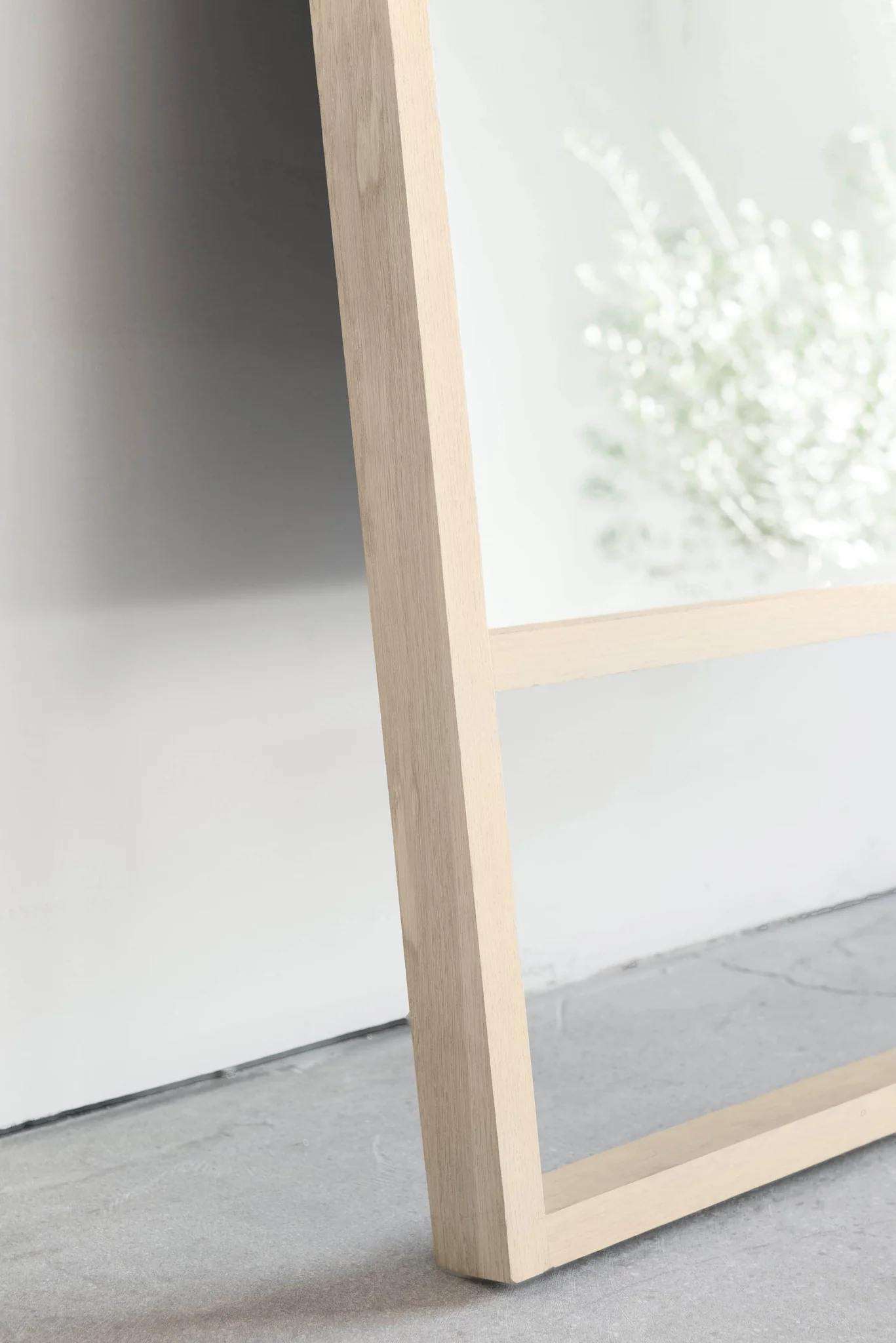 The Rivera Oak Mirror is a leaning mirror with a wooden frame. Solid oak boards are sized and joined. Mirror cut to size.