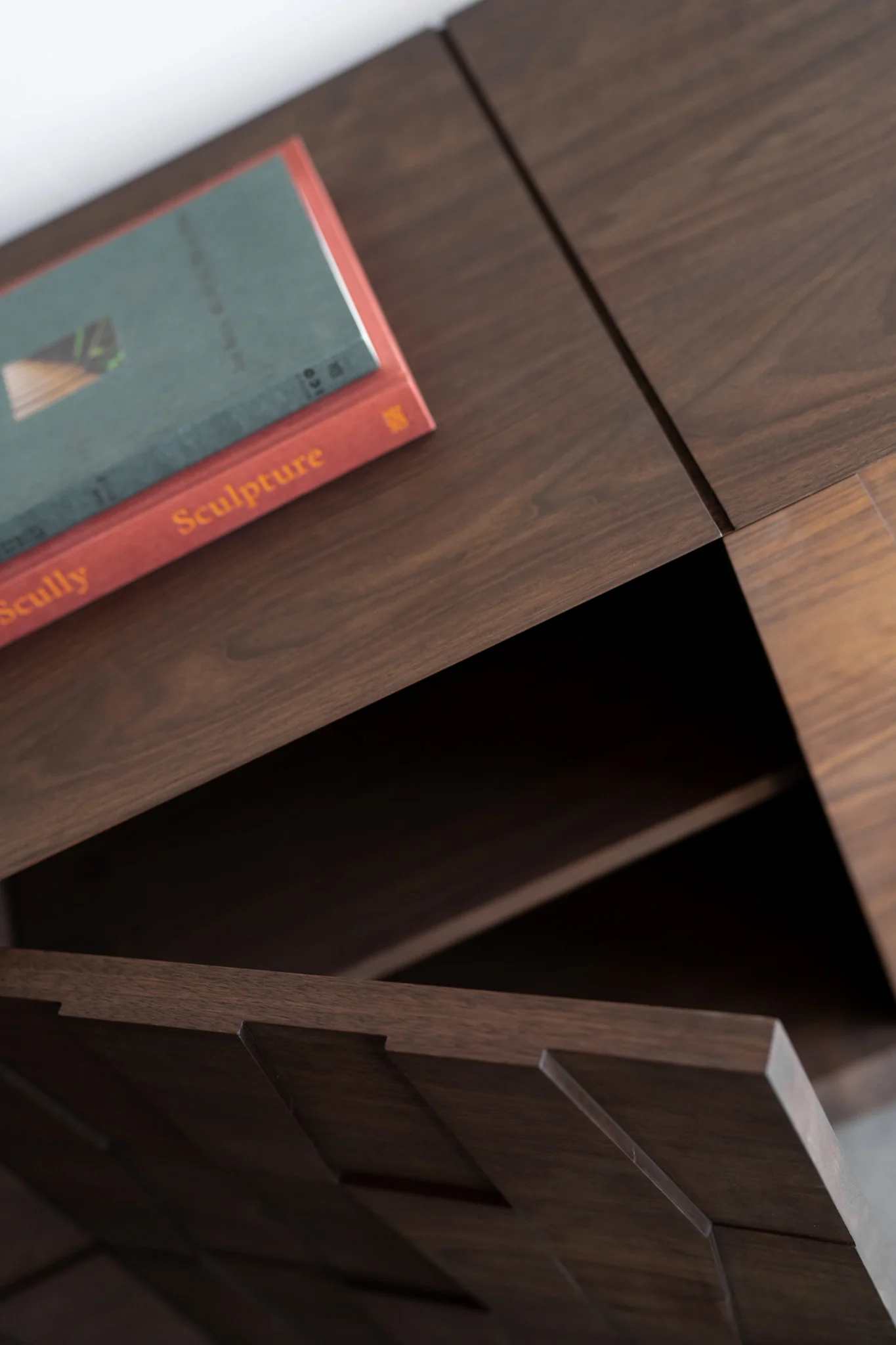 The Robles Credenza embodies sculptural minimalism through its commanding presence and precise craftsmanship. The cabinet doors showcase a dynamic pattern of walnut panels, each precisely carved at varying depths to create an interplay of light and shadow across the surface. This artistic facade is contained within a masterfully constructed walnut casing, featuring mitered edges and intentional dados that align seamlessly with the door spacing. The piece is elevated by an architectural base in matching walnut, its thoughtfully proportioned supports providing a sense of weightless poise to the substantial form above. Every angle reveals a harmonious balance between technical precision and artistic vision, resulting in a piece that serves as both functional storage and sculptural statement.