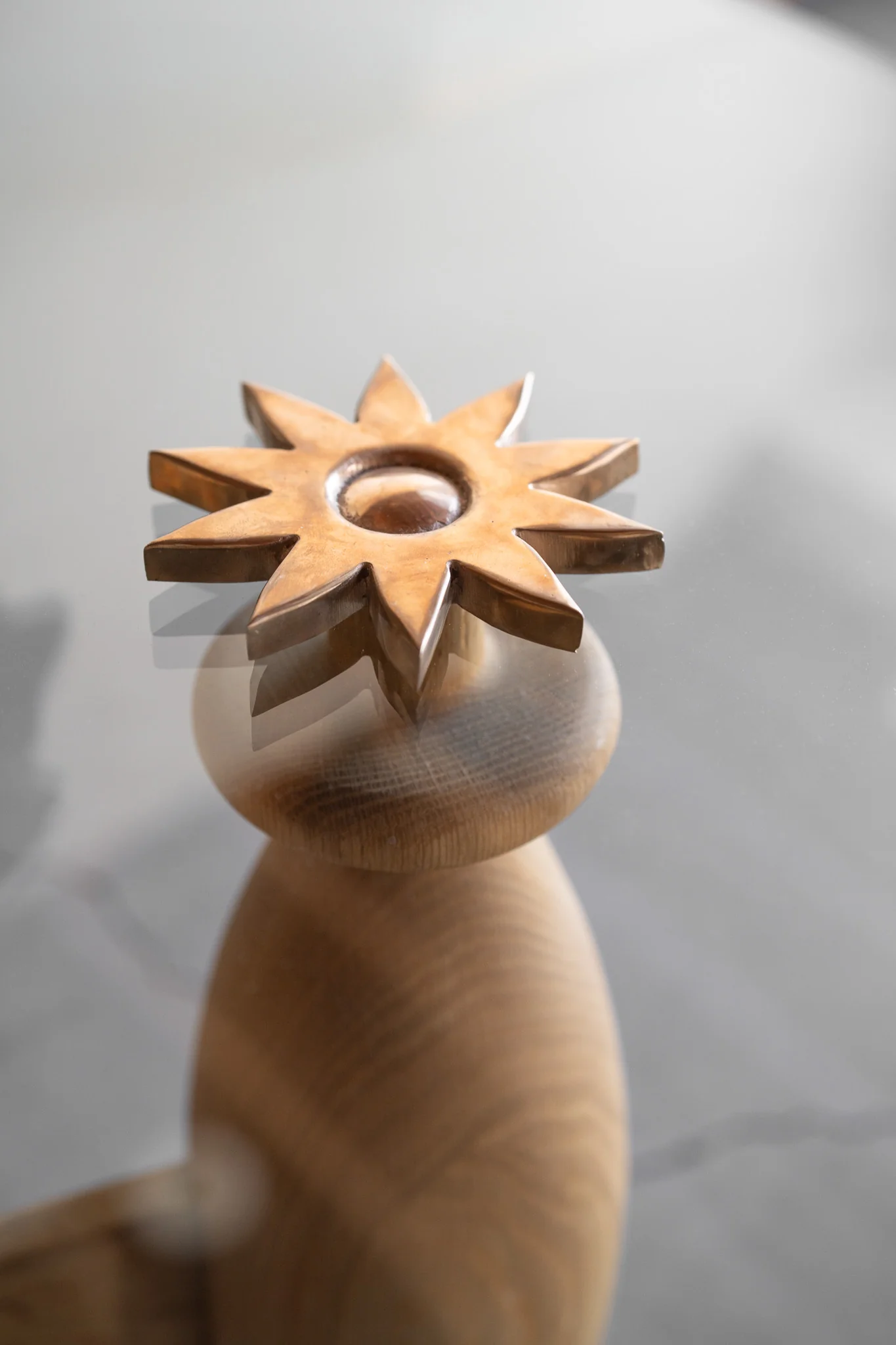 The Sonora Coffee Table is a study in sculptural form and natural inspiration. Its solid oak base features softly tapered, turned legs that ground the piece with an organic presence, connected by intersecting stretchers that introduce a refined architectural balance. A round glass top rests lightly on handcrafted bronze blossoms, allowing the entire structure to read as both airy and substantial.