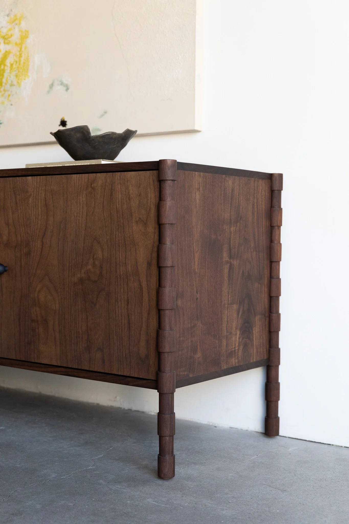 The solid walnut casing is paired with the defining focal point of the piece: elegantly turned legs that reference the hand-built details often found in Topanga’s eclectic architecture. These sculptural legs soften the sideboard’s clean, horizontal lines, introducing rhythm and texture while celebrating traditional woodworking techniques interpreted through a modern lens.