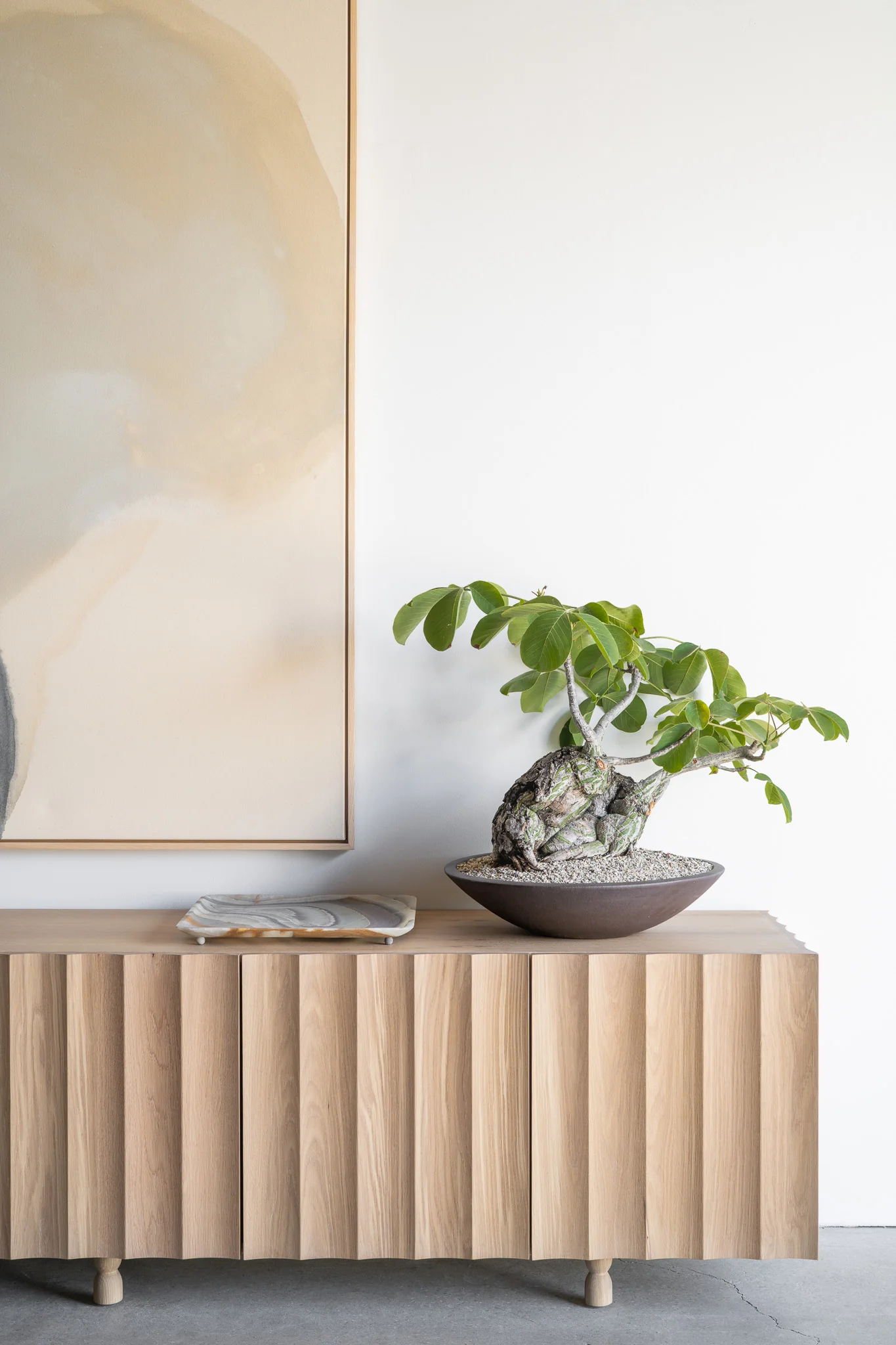 The Zuma Credenza captures the rhythmic beauty of California's coastline, drawing inspiration from both the iconic architectural curves of Frank Lloyd Wright's Marin County Civic Center and the undulating waves that define the Pacific shore.